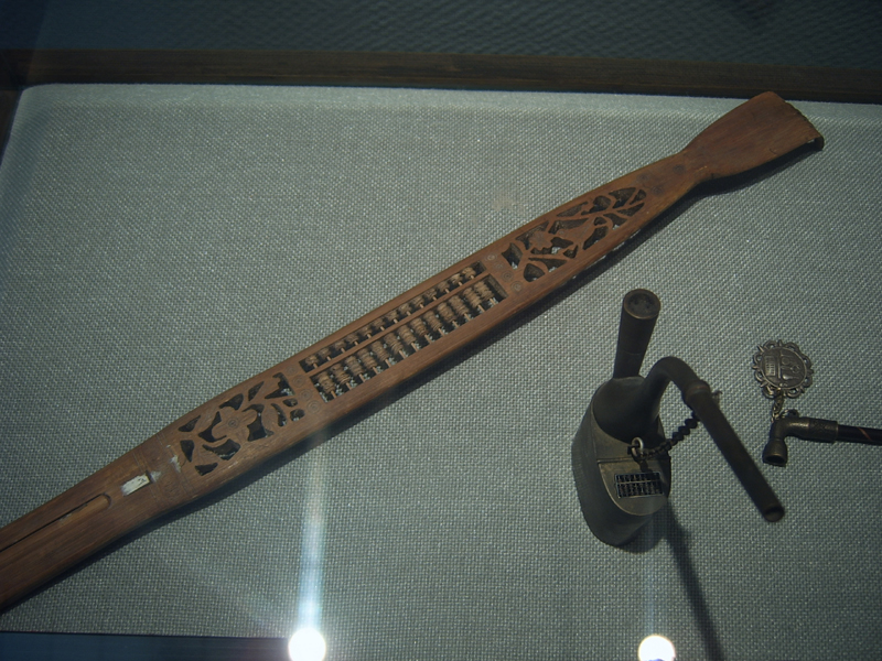 주판 틀이 들수도 없이 무겁고 크게 만든 몽둥이 주판과 주전자 사진